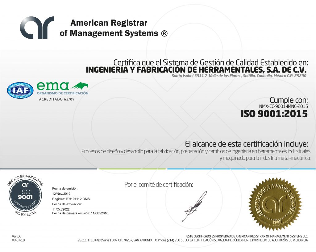 En INGENIERIA Y FABRICACION DE HERRAMENTALES S.A. DE C.V. nuestro compromiso es proporcionar productos y servicios de diseño y fabricación de herramentales para la industria metal-mecánica, que satisfagan los requerimientos del cliente y partes interesadas, cumpliendo con las normativa regulatoria aplicable de nuestra industria, estableciendo objetivos y metas buscando la mejora continua, en un entorno seguro y en armonía con el medio ambiente a través de la implementación del sistema de Gestión de la Calidad en base a la norma ISO-9001 versión 2015. FECHA 15-01-2021 REV.00